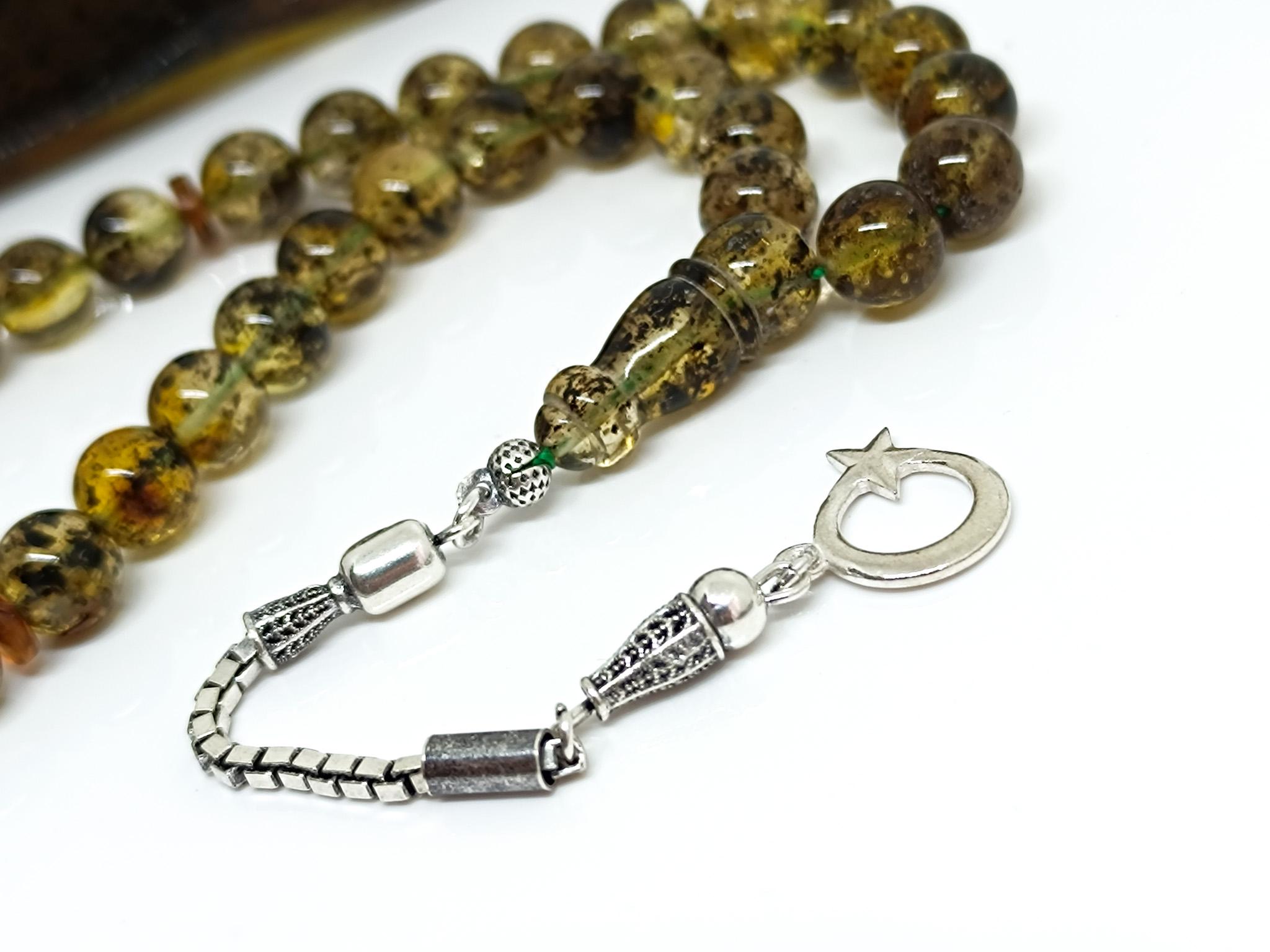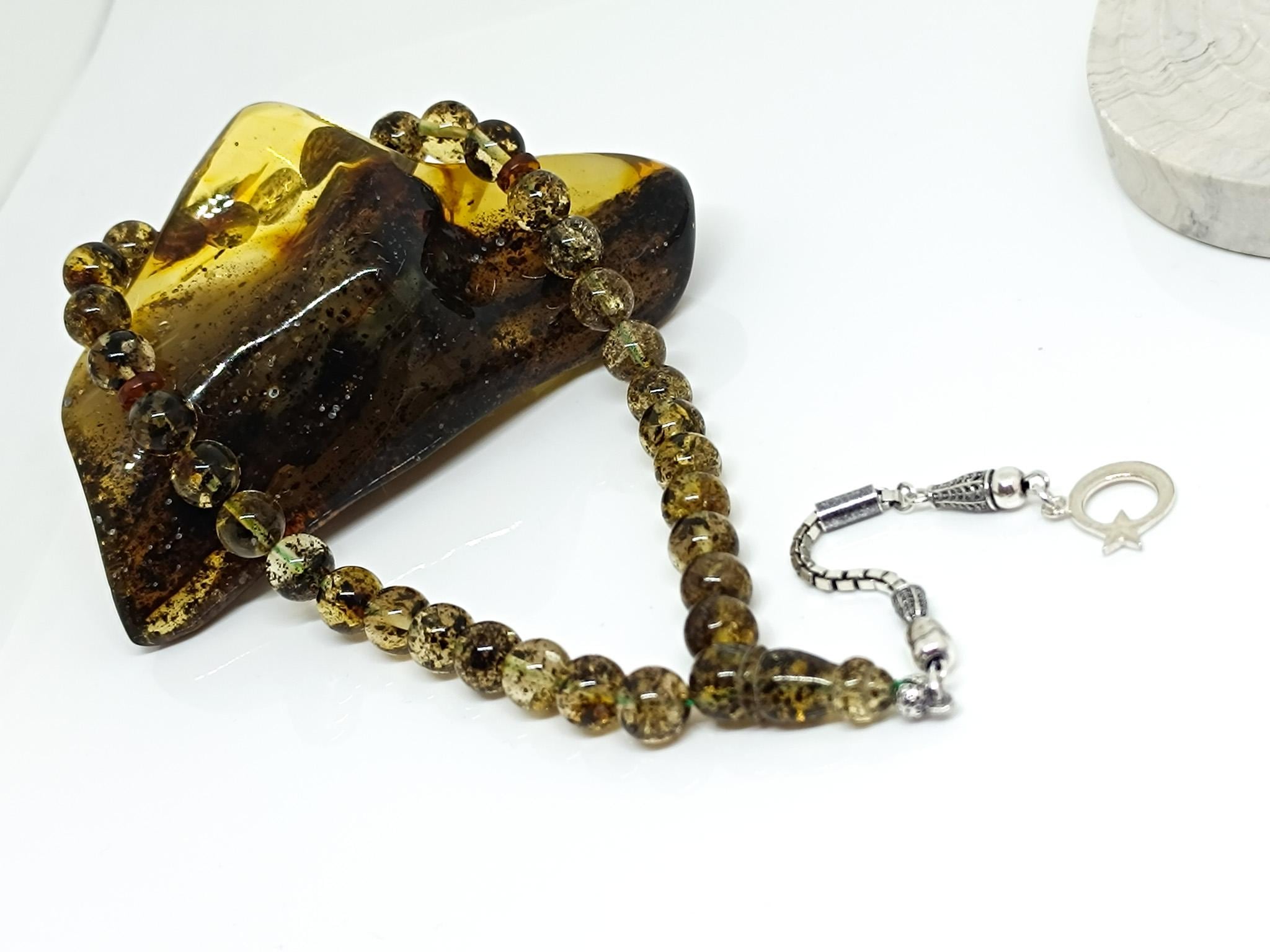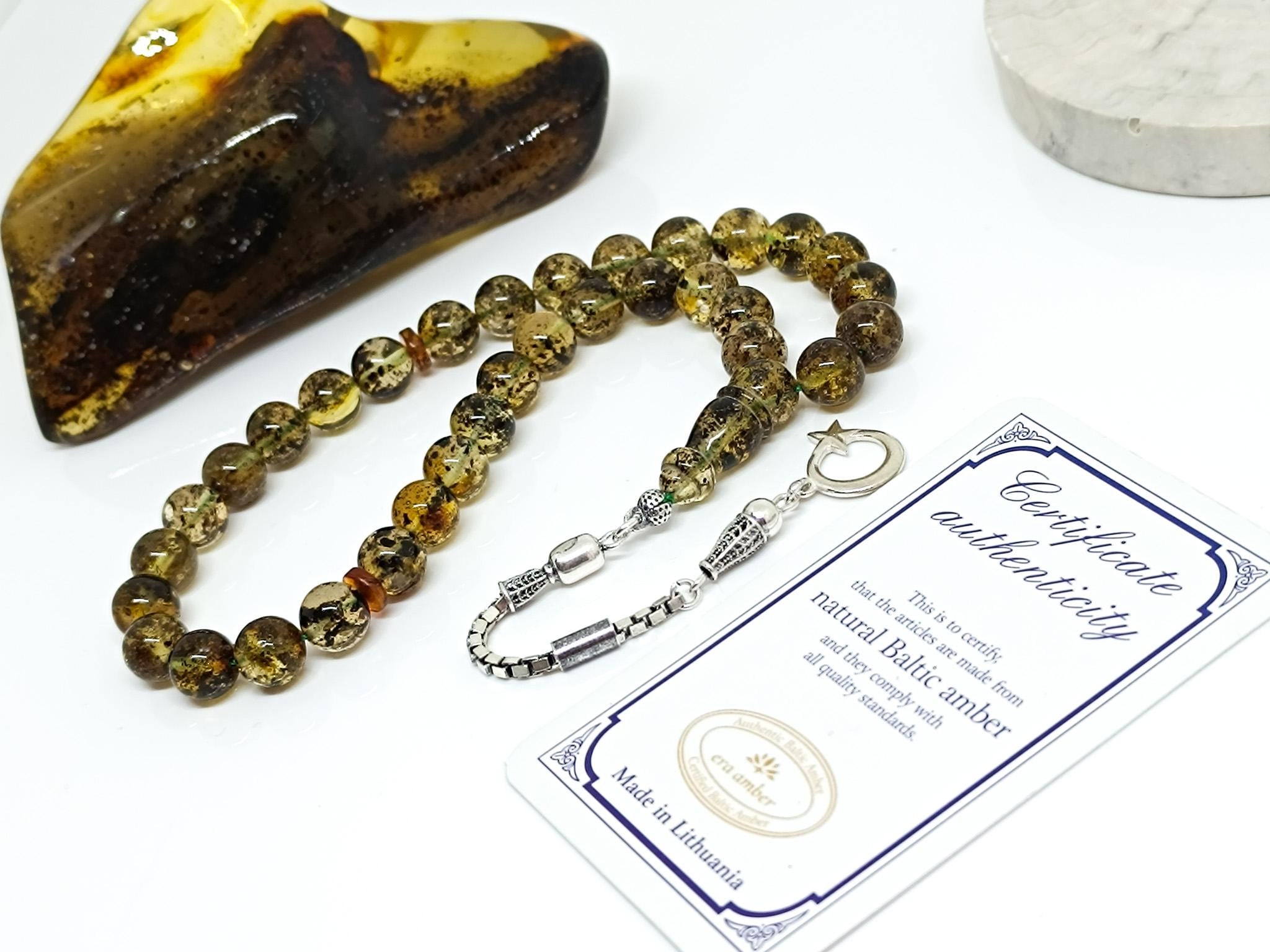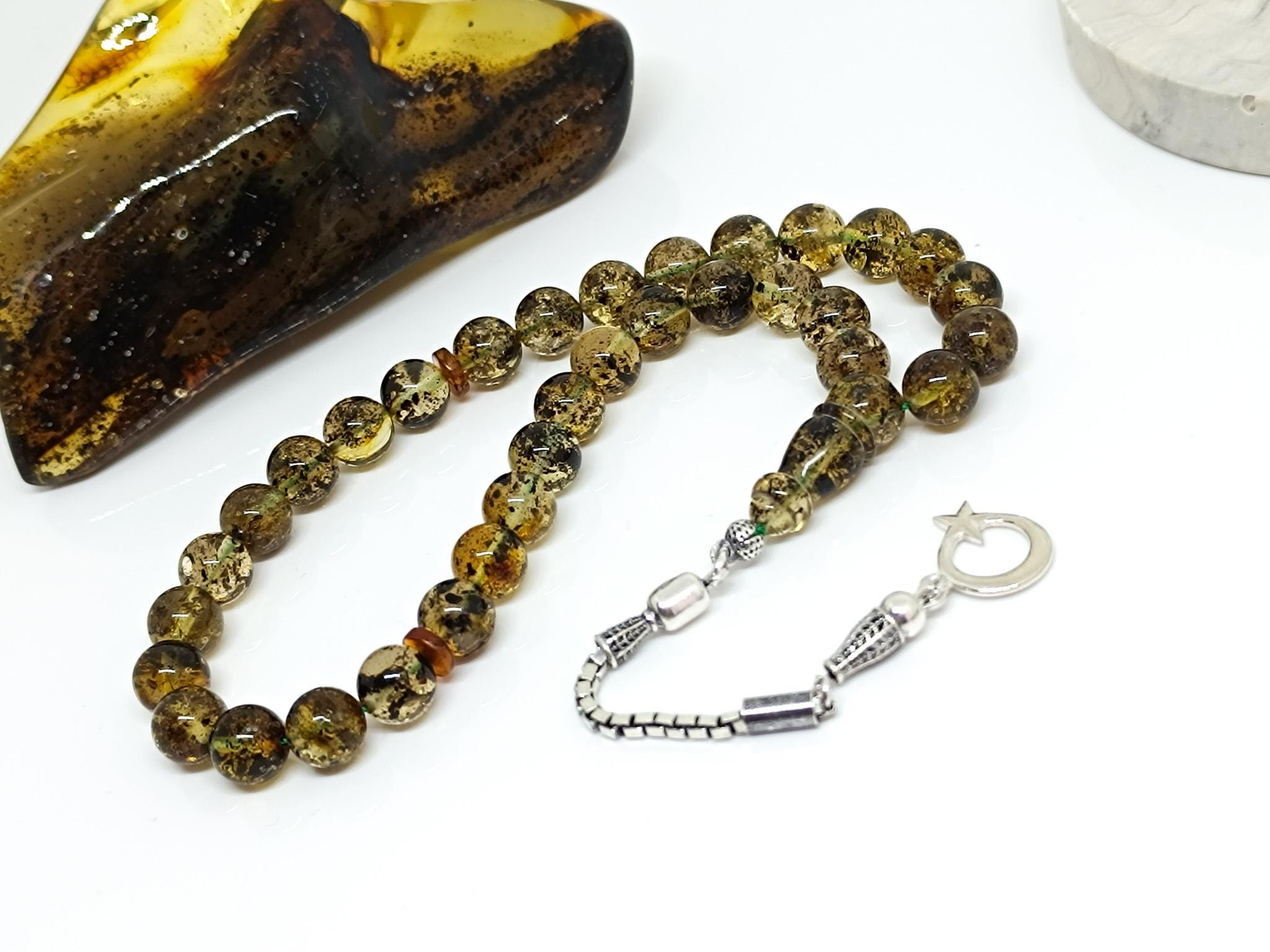 Genuine Baltic Amber Rosary with Plant Fossils, 925 Silver Tassel, Islamic Tesbih