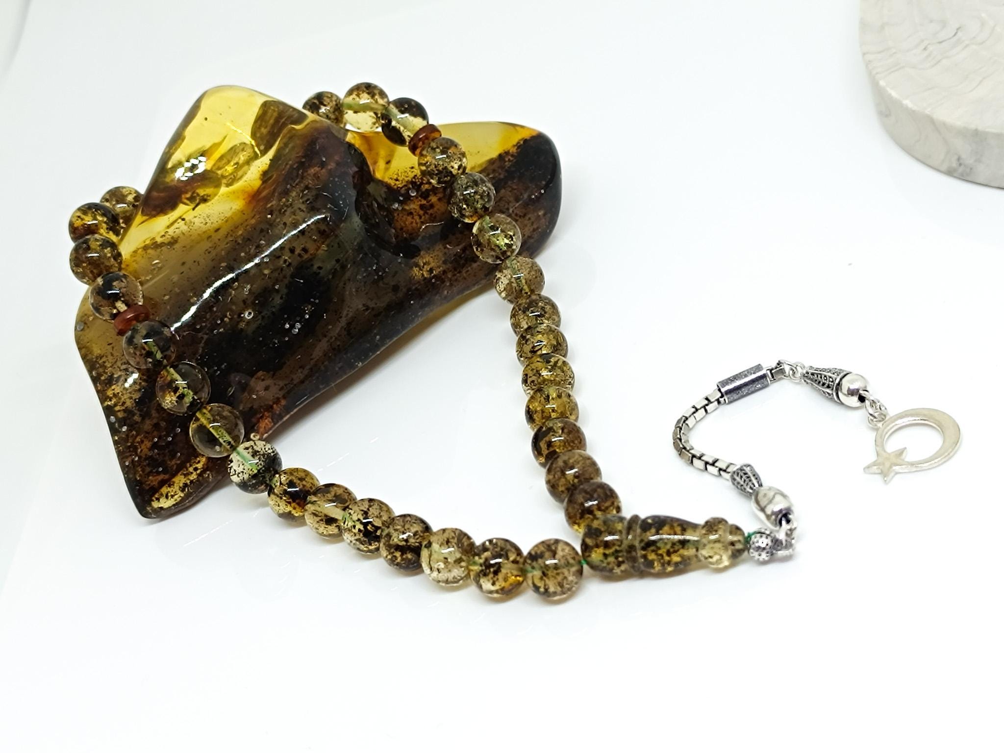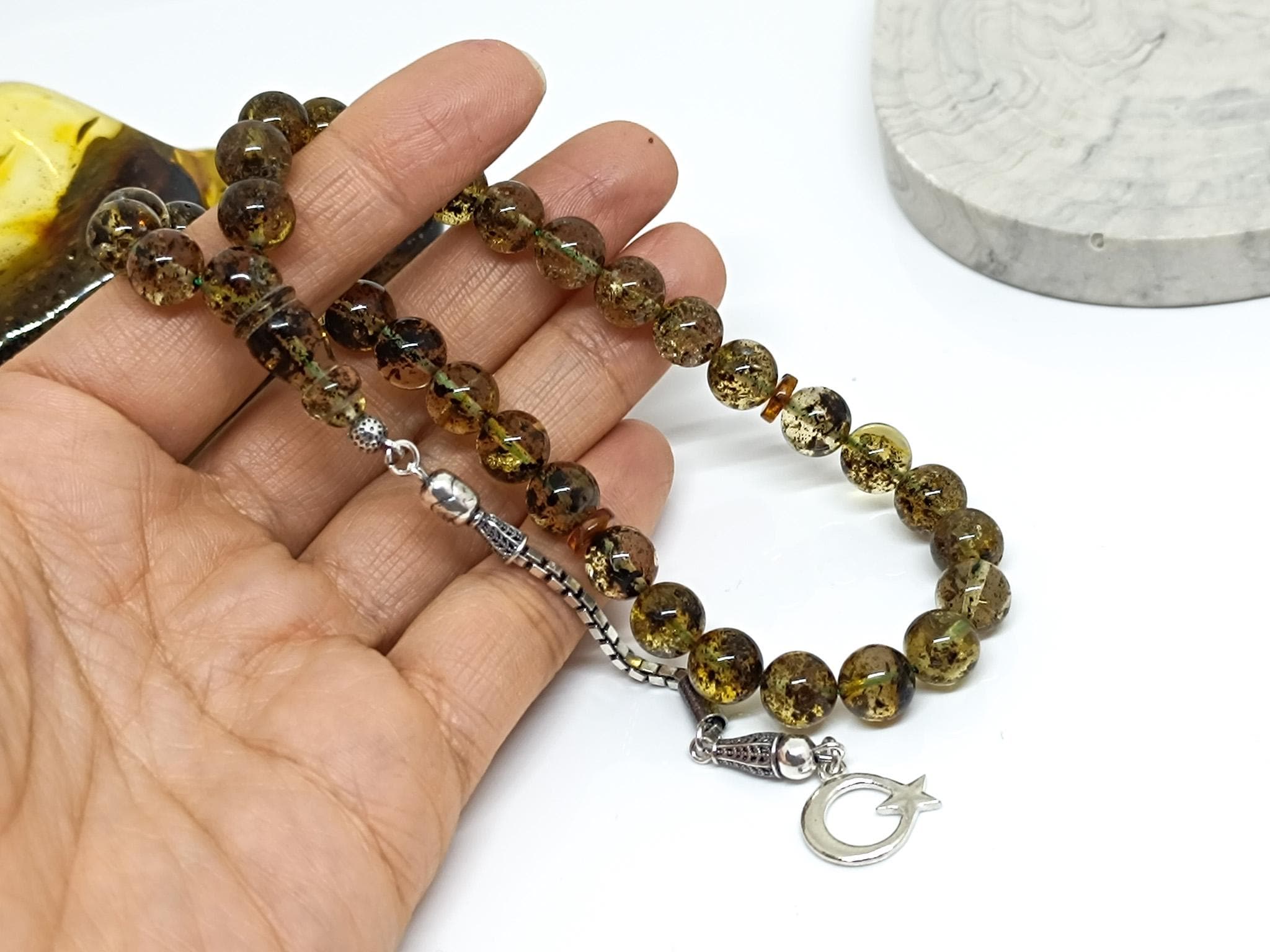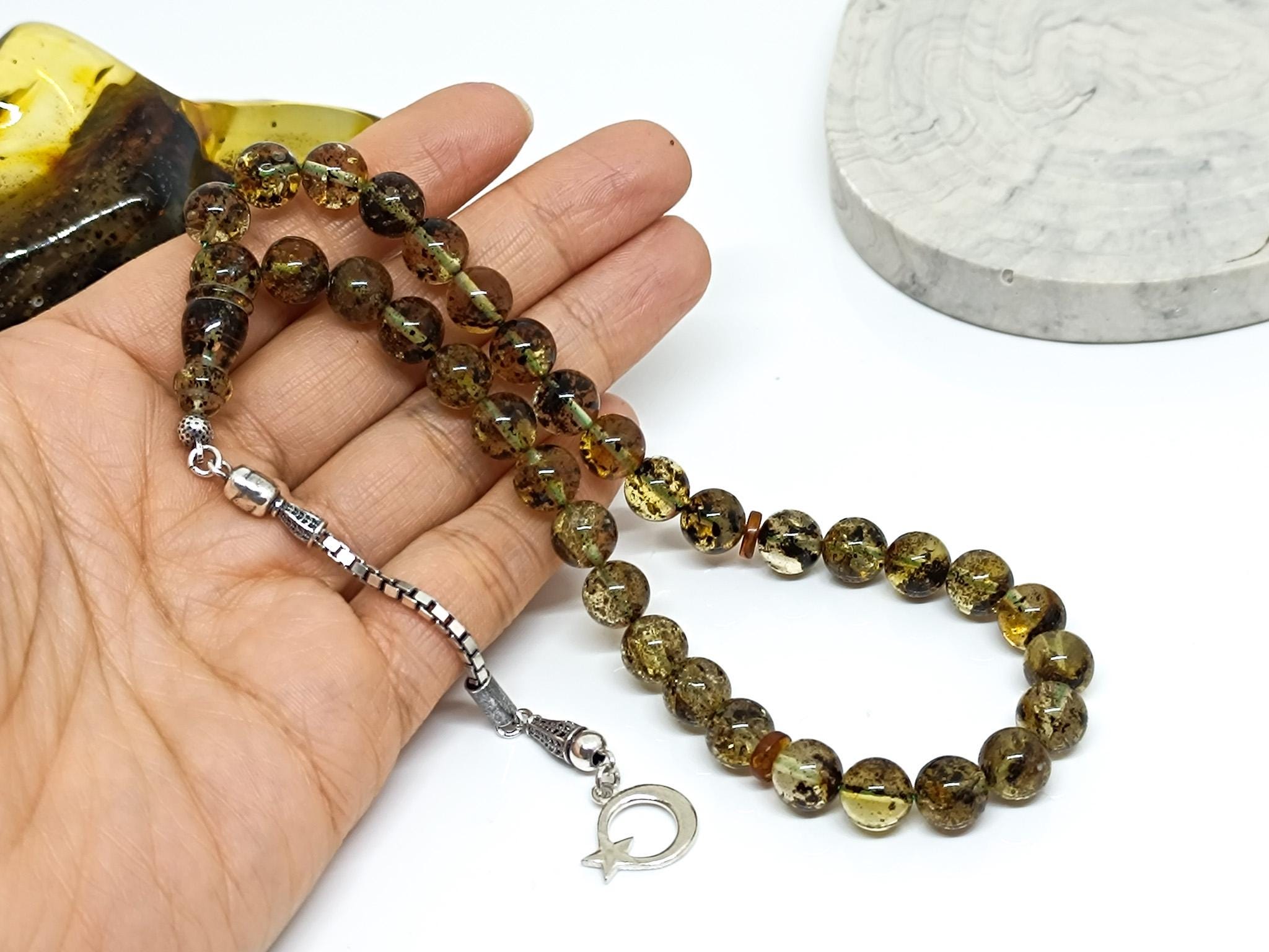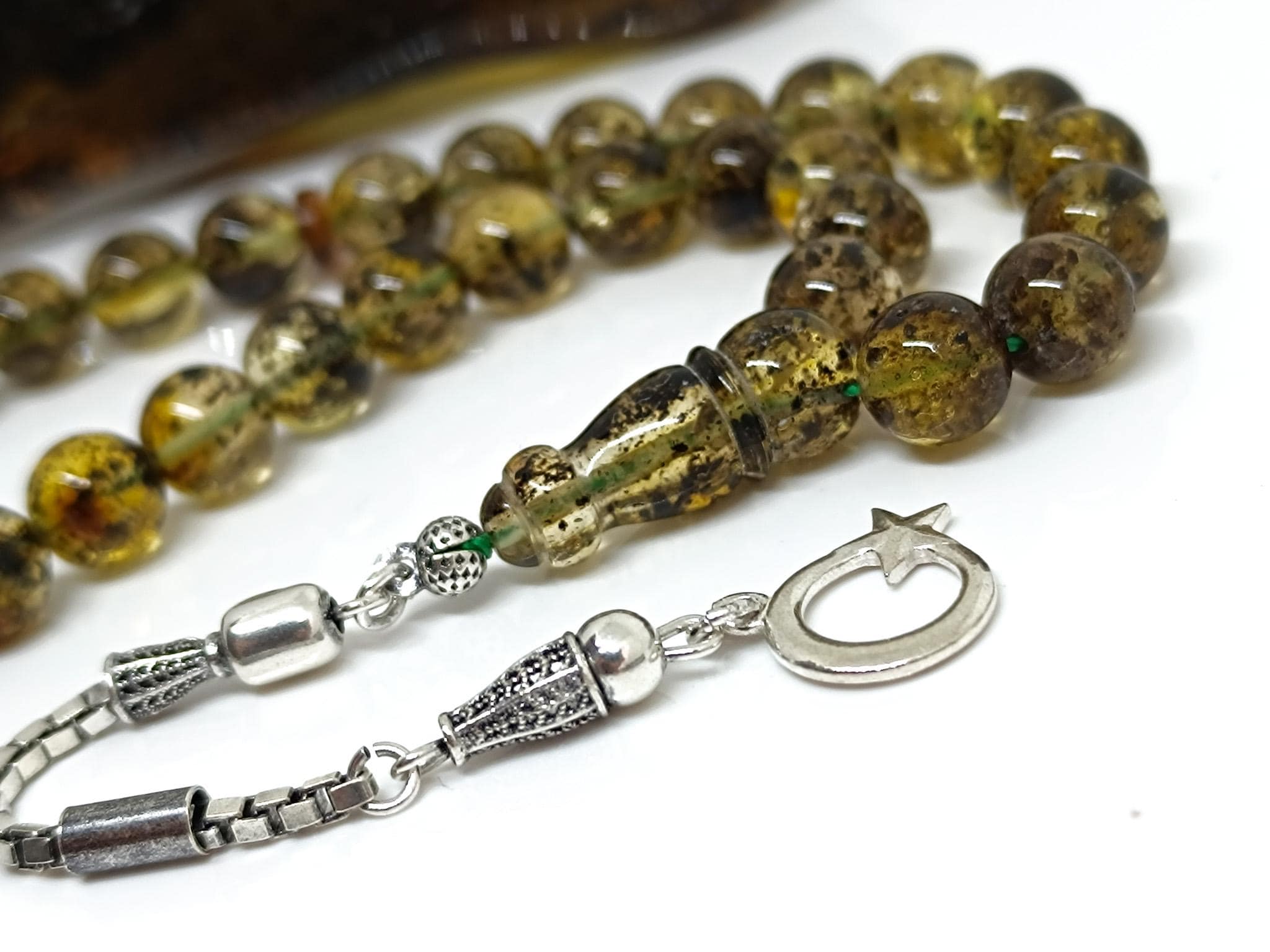 Genuine Baltic Amber Rosary with Plant Fossils, 925 Silver Tassel, Islamic Tesbih