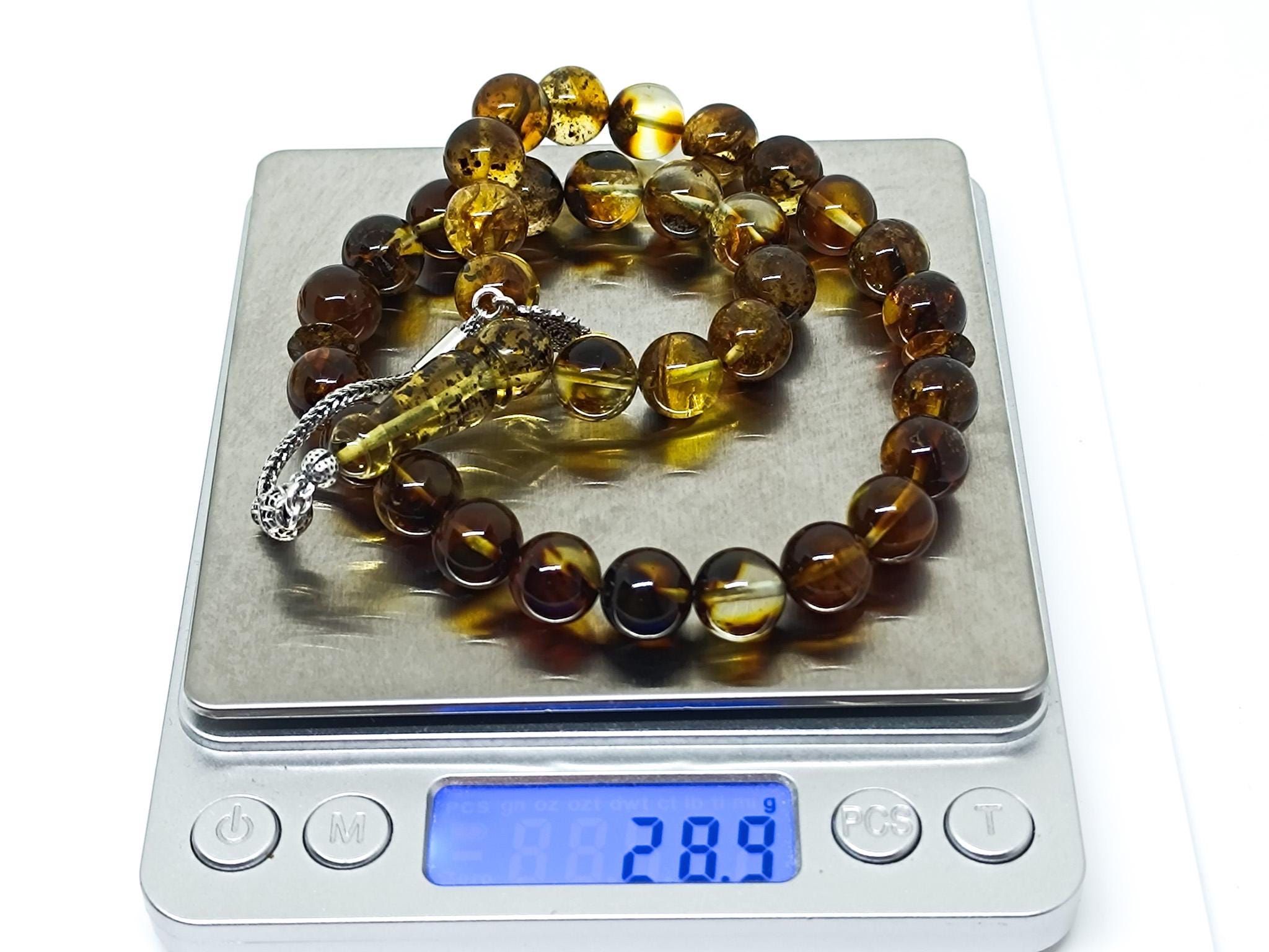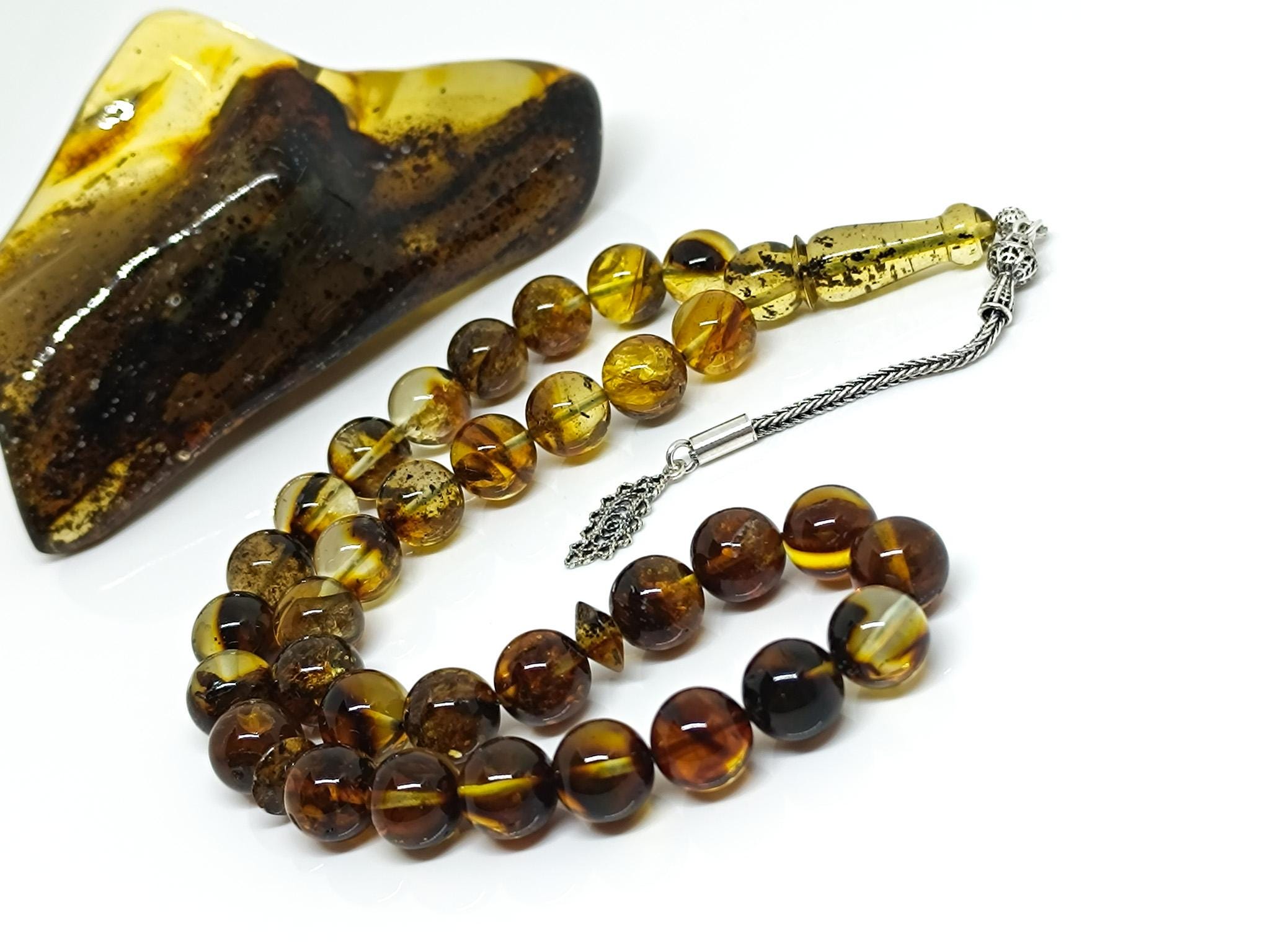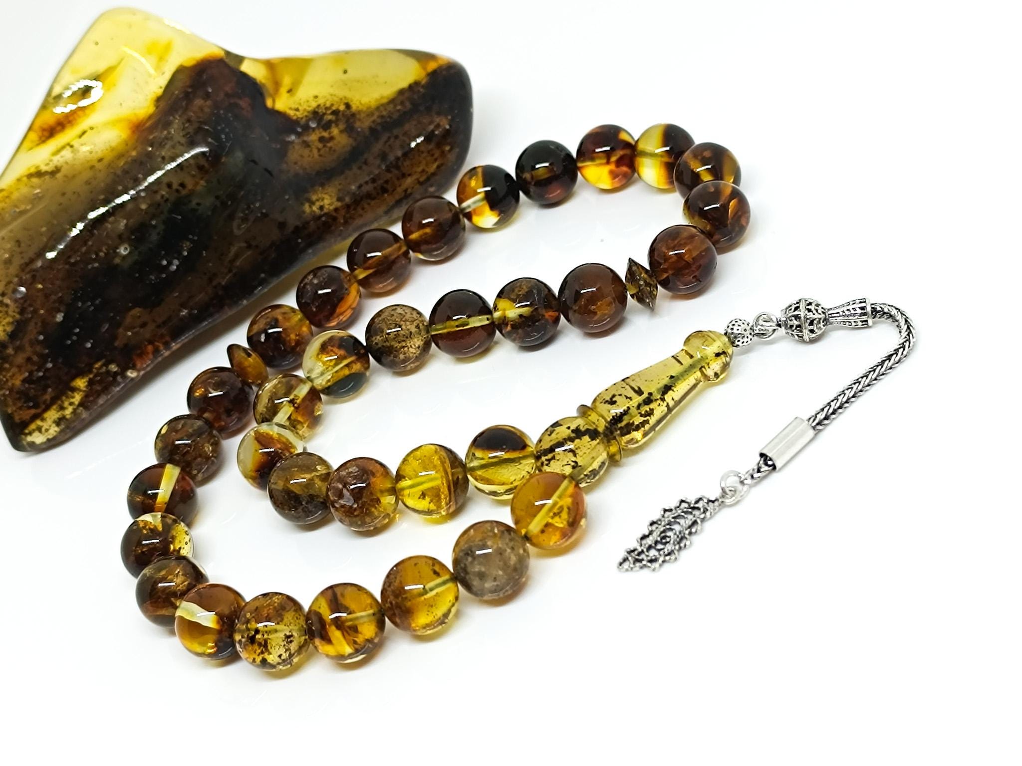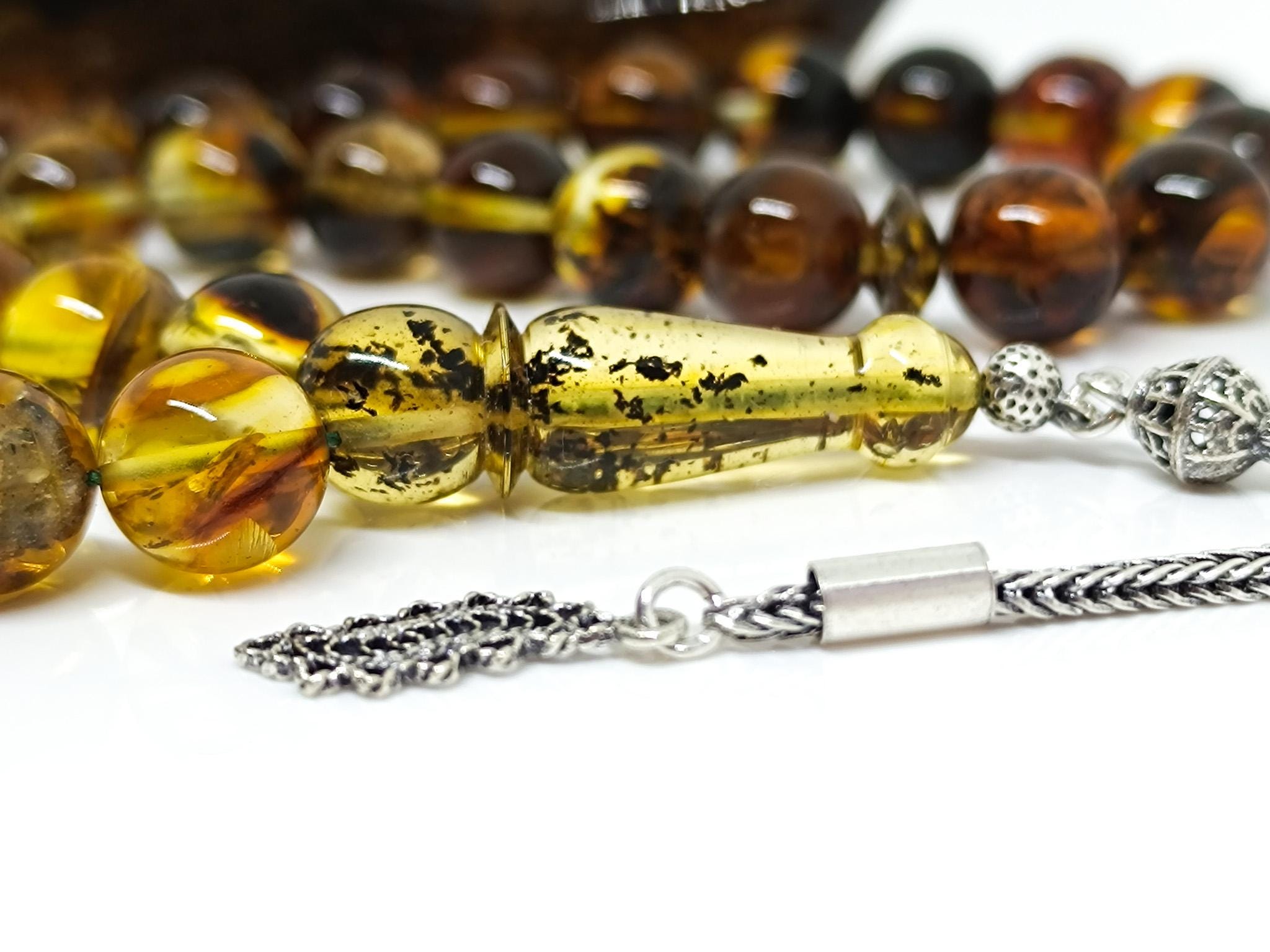 Real Baltic Amber Rosary with Plant Fossils & 925 Silver Tassel, Amber with Plant,Natural Baltic Amber Islamic Rosary, Amber Tesbih,11mm