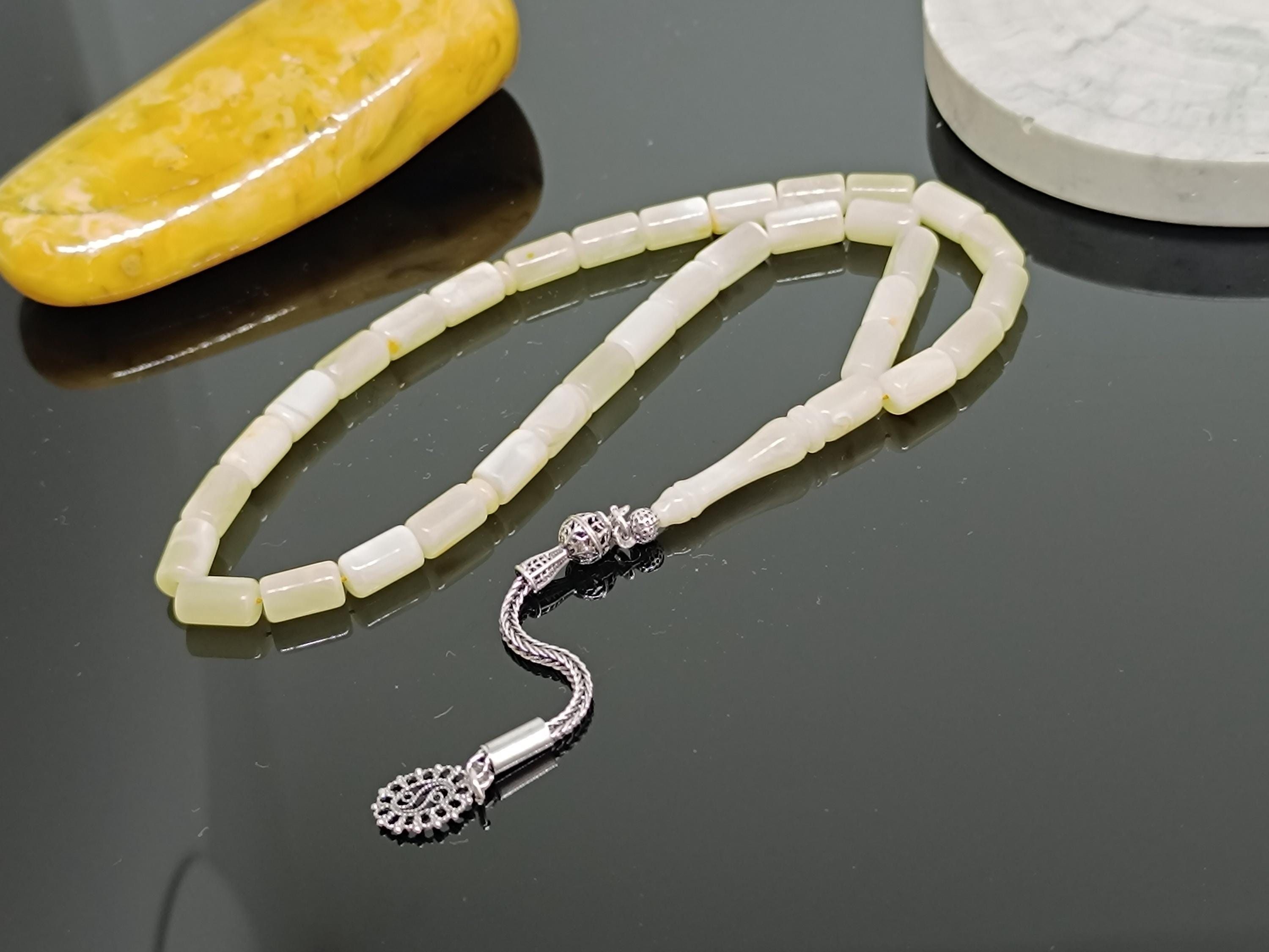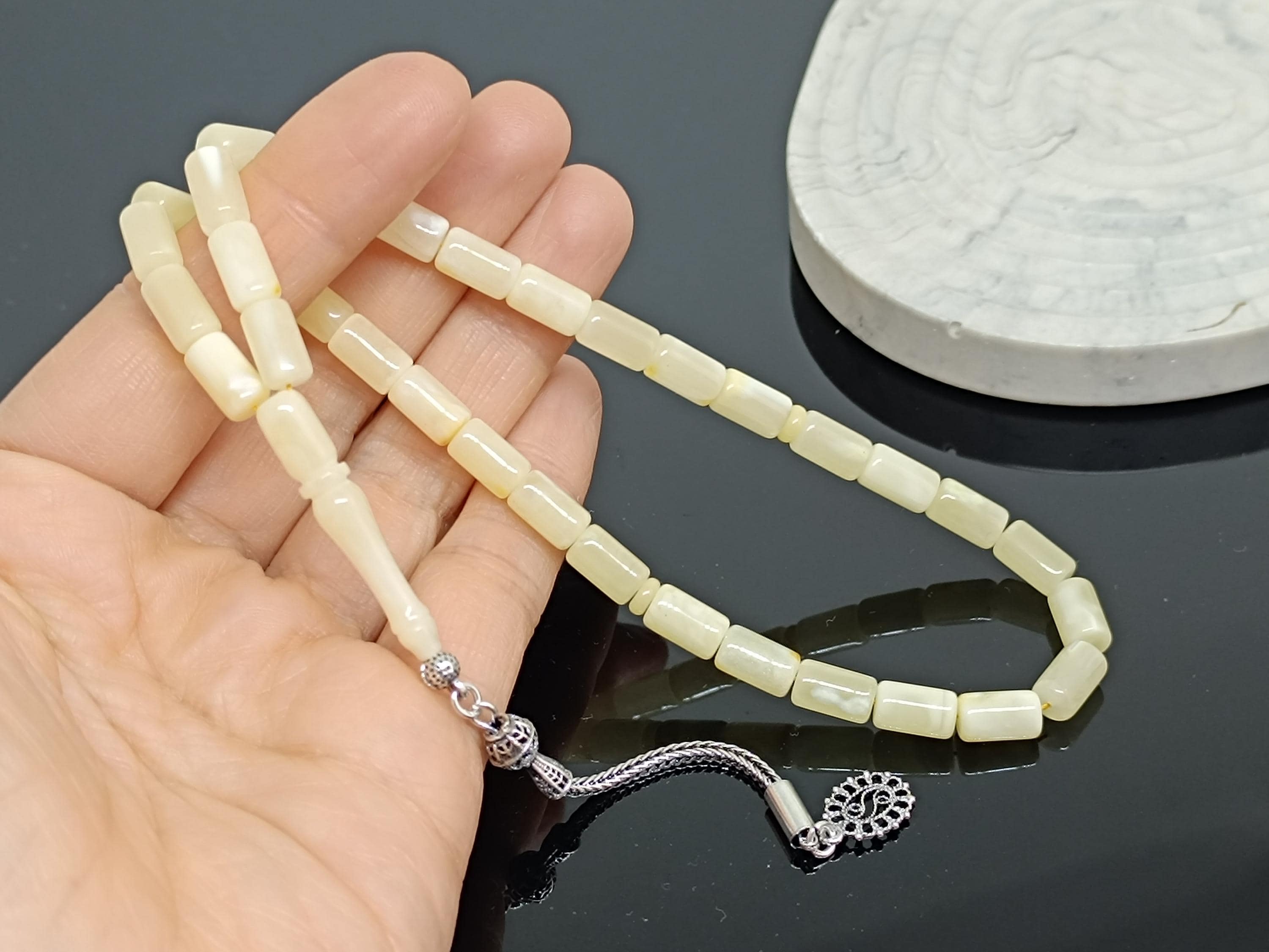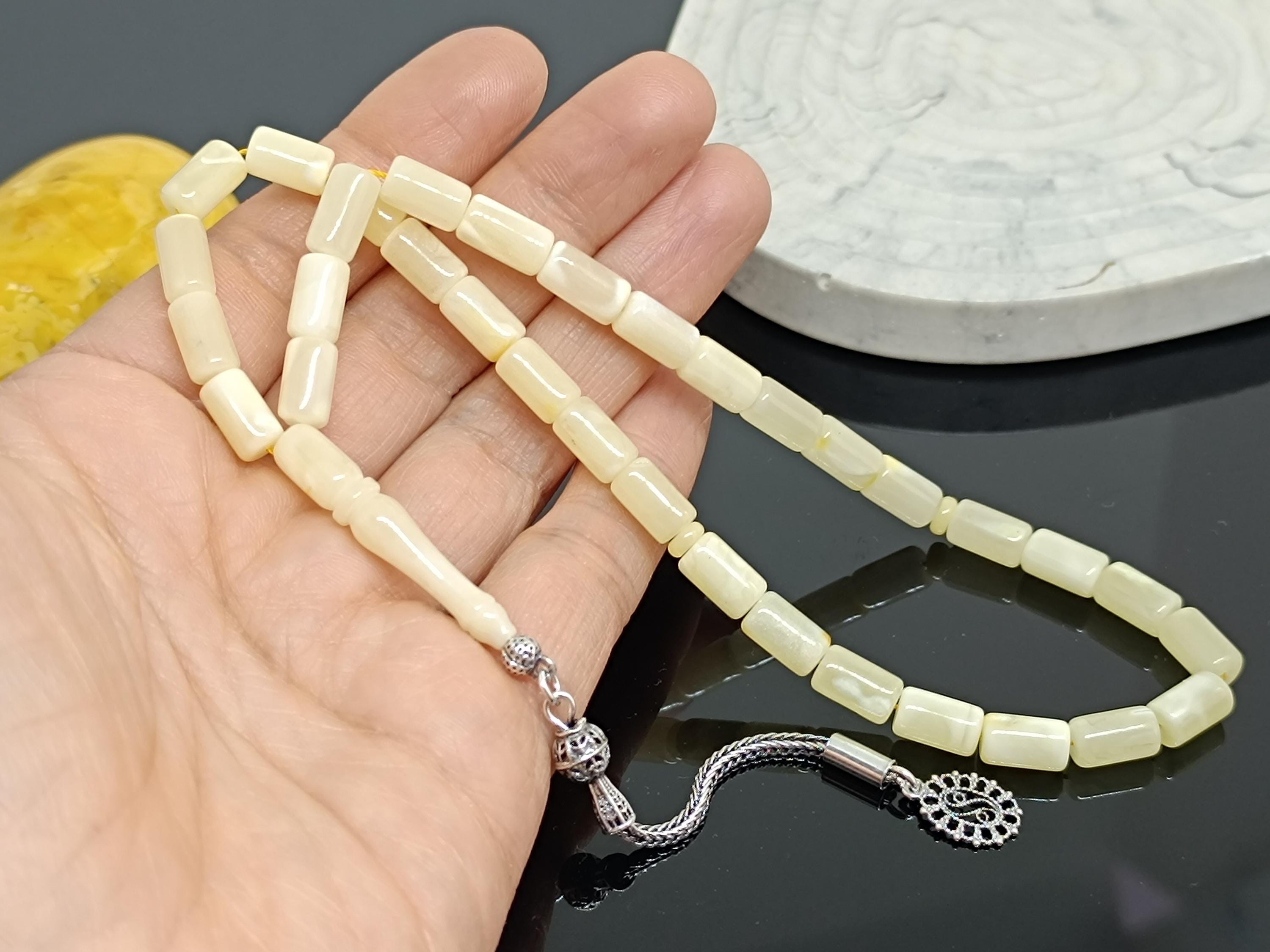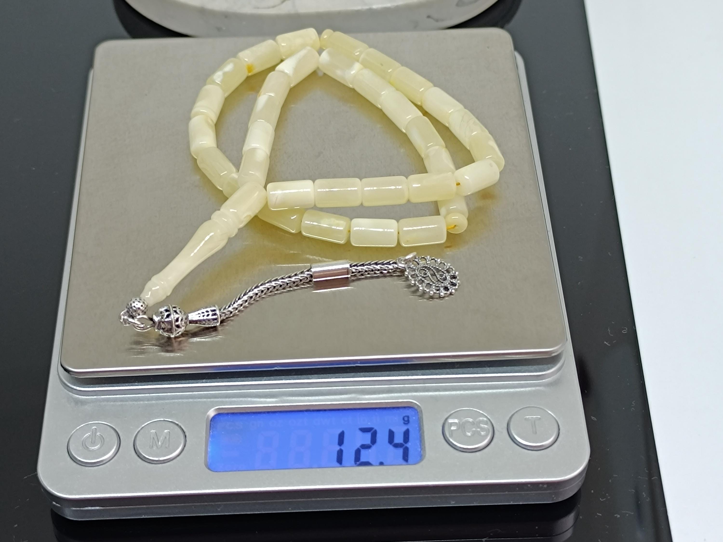 White Baltic Amber Rosary, 33 Beads, Sterling Silver Tassel, Islamic Prayer Beads