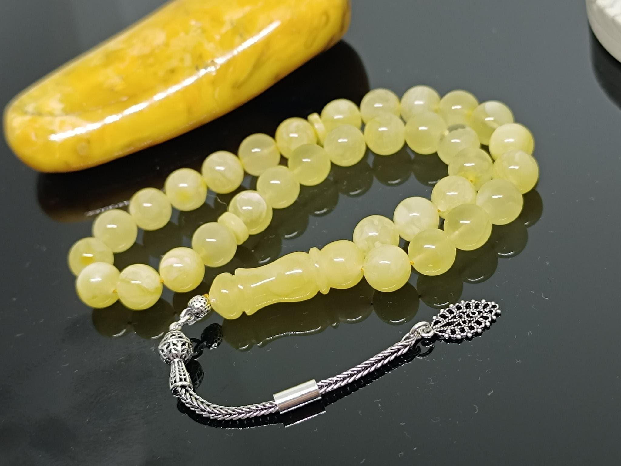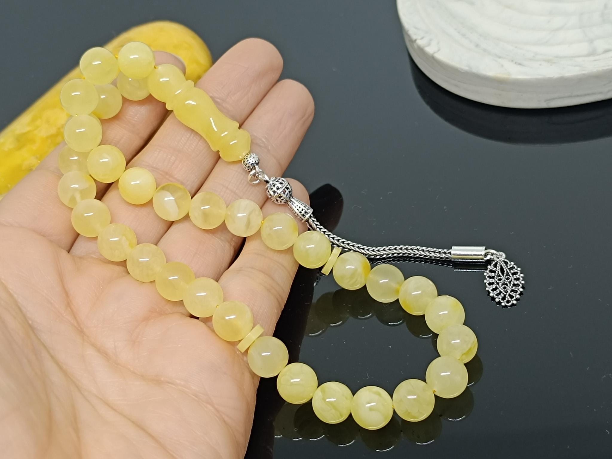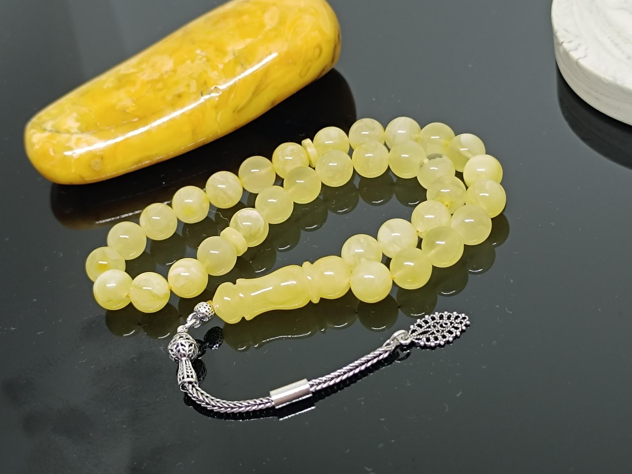 Natural Baltic Amber Rosary, 33 Beads, 925 Sterling Silver, Islamic Tesbih (9mm)