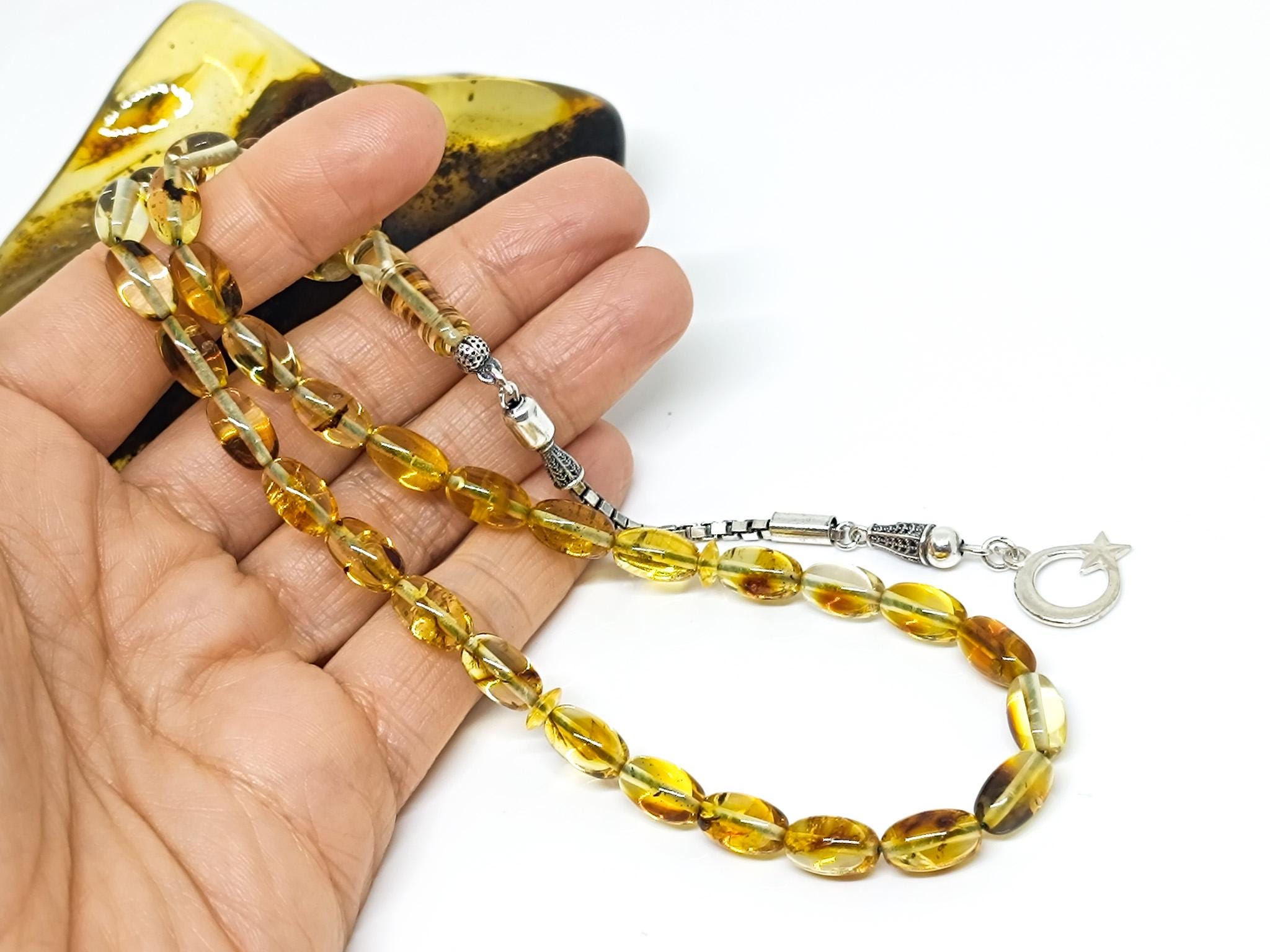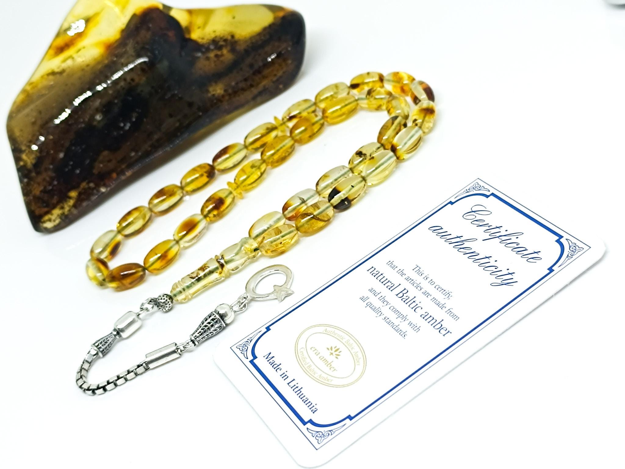 Baltic Amber Rosary with 925 Sterling Silver Tassel,Natural Amber Islamic Rosary, Amber Rosary with Plant Fossil, Kahraman, Kehribar Tesbih